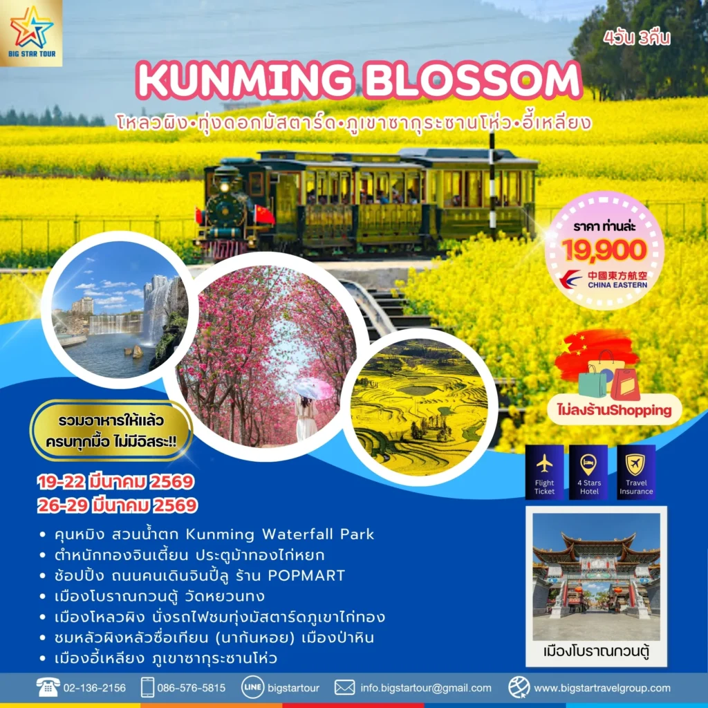 ทัวร์จีน เทศกาลดอกไม้บาน[BSTKMGM26] คุนหมิง-ผิงโหลว-ซากุระอี้เหลียง | 4 วัน 3 คืน admin February 21, 2026March 27, 2026 19-22 มีนาคม และ 26-29 มีนาคม 25694 วัน | 3 คืน ราคาโปรแกรมทัวร์4 วัน 3 คืนราคาเริ่มต้น / ท่าน19,900฿ รายละเอียดการเดินทางวันเดินทาง19-22 มีนาคม และ 26-29 มีนาคม 2569สายการบินLucky Air (8L)สนามบิน ขาไป: สุวรรณภูมิ (BKK) คุนหมิง (KMG)ขากลับ: คุนหมิง (KMG) สุวรรณภูมิ (BKK) TRAVEL PLAN แผนการเดินทาง Map ติดต่อสอบถามการเดินทาง พร้อมดูแลและให้คำปรึกษาการเดินทาง ที่ตอบโจทย์ทุกความต้องการ 26/68 หมู่บ้านเอกกวินทาวน์โฮม ถนนเลียบคลองสอง แขวงบางชัน เขตคลองสามวา กรุงเทพมหานคร 10510 Hotline: 086-576-5815 Tel: 02-136-2156 , bigstartravelgroup bigstartour ทักแชท จองเลย!