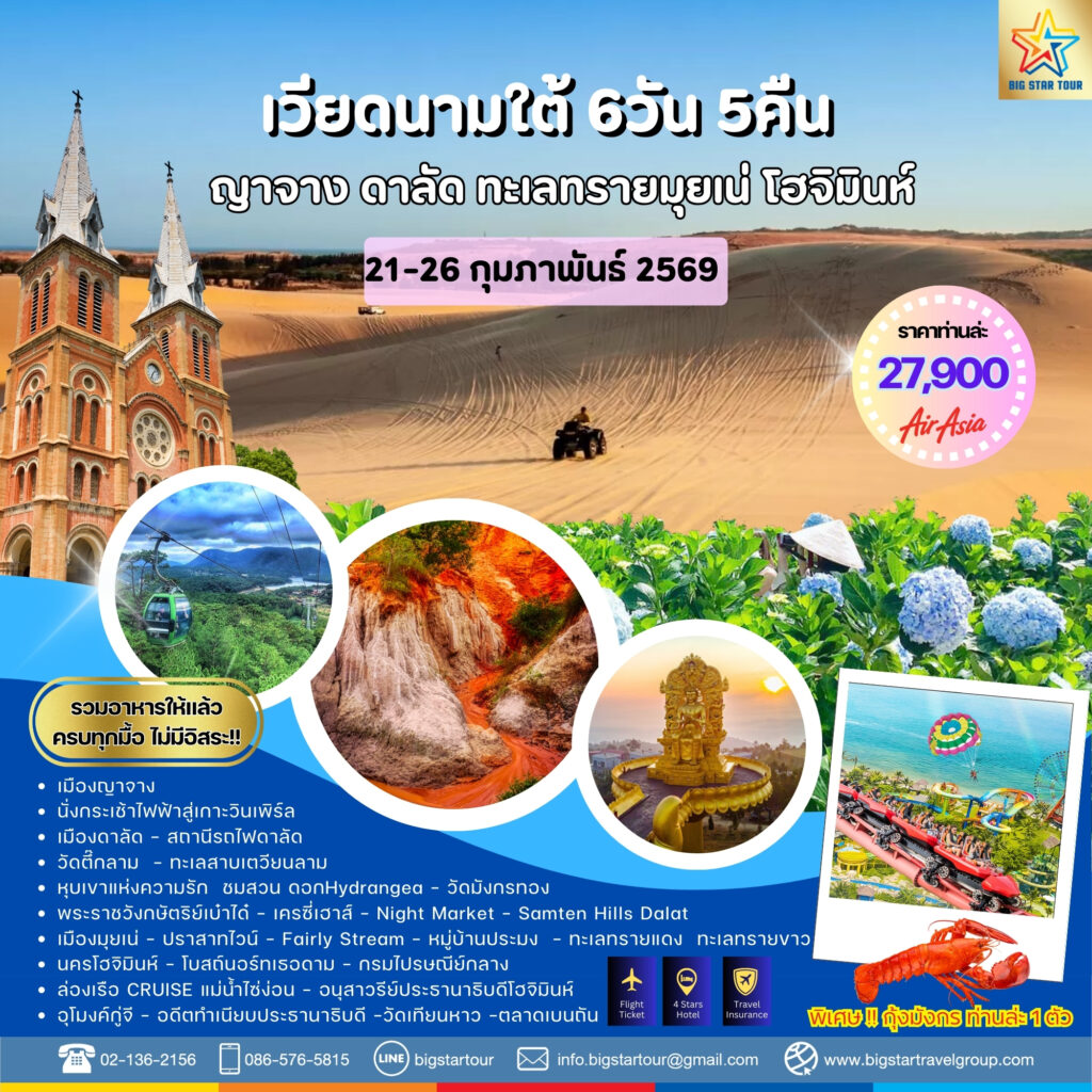 ทัวร์เวียดนาม[CXR] เที่ยวคุ้ม ญาจาง-ดาลัด-มุยเน่-โฮจิมินห์ | 6 วัน 5 คืน admin February 25, 2026April 9, 2026 21-26 กุมภาพันธ์ 25696 วัน | 5 คืน ราคาโปรแกรมทัวร์6 วัน 5 คืนราคาเริ่มต้น / ท่าน27,900฿ รายละเอียดการเดินทาง วันเดินทาง 21-26 กุมภาพันธ์ 2569 สายการบิน ไปกลับ AirAsia (FD) / สนามบินกามรัญ และ สนามบินโตนเซินเญิต สนามบิน ขาไป: สนามบินดอนเมือง (DMK) – สนามบินกามรัญ (CXR) FD646 07.55 – 09.55 ขากลับ: สนามบินโตนเซินเญิต (SGN) – สนามบินดอนเมือง (DMK) FD659 21.35 – 23.05 TRAVEL PLAN แผนการเดินทาง Map ติดต่อสอบถามการเดินทาง พร้อมดูแลและให้คำปรึกษาการเดินทาง ที่ตอบโจทย์ทุกความต้องการ 26/68 หมู่บ้านเอกกวินทาวน์โฮม ถนนเลียบคลองสอง แขวงบางชัน เขตคลองสามวา กรุงเทพมหานคร 10510 Hotline: 086-576-5815 Tel: 02-136-2156 , bigstartravelgroup bigstartour ทักแชท จองเลย!