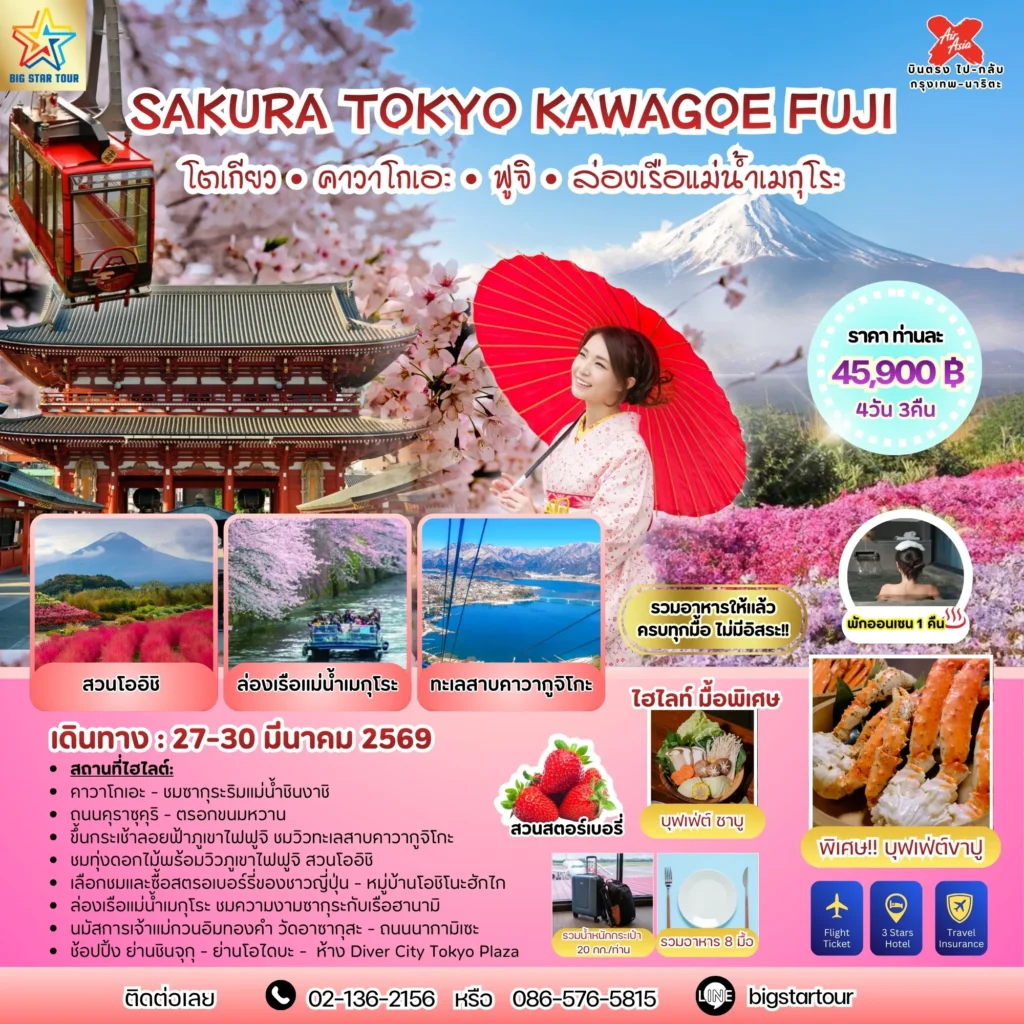 ทัวร์ญี่ปุ่น เทศกาลดอกไม้บาน[NRT04] ซากุระโตเกียว คาวาโกเอะ ฟูจิ | 4 วัน 3 คืน admin February 25, 2026March 23, 2026 27-30 มีนาคม 25694 วัน | 3 คืน ราคาโปรแกรมทัวร์4 วัน 3 คืนราคาเริ่มต้น / ท่าน45,900฿ รายละเอียดการเดินทางวันเดินทาง27-30 มีนาคม 2569สายการบิน ไปกลับ AirAsia X (XJ) / สนามบินนาริตะสนามบิน ขาไป: สนามบินสุวรรณภูมิ (BKK) – สนามบินนาริตะ (NRT) XJ600 23.55 – 08.00ขากลับ: สนามบินนาริตะ (NRT) – สนามบินสุวรรณภูมิ (BKK) XJ601 09.15 – 14.35 Impressive Landmarks... Delivering Joy Every Step of the Way. พิกัดประทับใจ.. ส่งมอบความสุขตลอดเส้นทาง TRAVEL PLAN แผนการเดินทาง Map ติดต่อสอบถามการเดินทาง พร้อมดูแลและให้คำปรึกษาการเดินทาง ที่ตอบโจทย์ทุกความต้องการ 26/68 หมู่บ้านเอกกวินทาวน์โฮม ถนนเลียบคลองสอง แขวงบางชัน เขตคลองสามวา กรุงเทพมหานคร 10510 Hotline: 086-576-5815 Tel: 02-136-2156 , bigstartravelgroup bigstartour ทักแชท จองเลย!