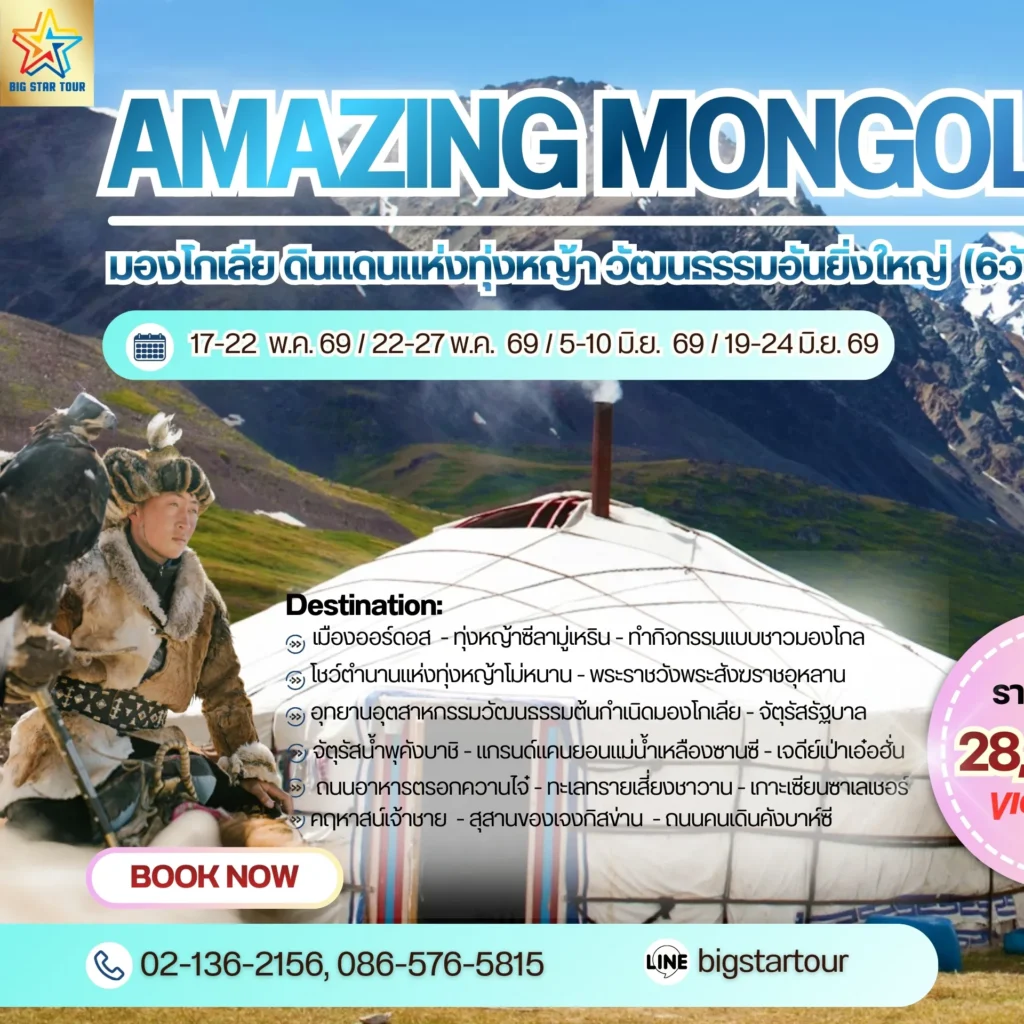 ทัวร์จีน[DNS] มหัศจรรย์ มองโกเลียใน | 6 วัน 5 คืน admin February 24, 2026March 13, 2026 17-22 พ.ค. / 22-27 พ.ค. / 5-10 มิ.ย. / 19-24 มิ.ย. 25696 วัน | 5 คืน ราคาโปรแกรมทัวร์6 วัน 5 คืนราคาเริ่มต้น / ท่าน28,900฿ รายละเอียดการเดินทางวันเดินทาง17-22 พ.ค. / 22-27 พ.ค. / 5-10 มิ.ย. / 19-24 มิ.ย. 2569สายการบินไปกลับ Thai Vietjet (VZ) / สนามบินนานาชาติสุวรรณภูมิสนามบิน ขาไป: สนามบินสุวรรณภูมิ (BKK) – สนามบินเออร์ดอสเออร์จิน (DSN) VZ3534 16:00 – 21:45ขากลับ: สนามบินเออร์ดอสเออร์จิน (DSN) – สนามบินสุวรรณภูมิ (BKK) VZ3535 22:45 – 03:00 (+1) TRAVEL PLAN แผนการเดินทาง Map ติดต่อสอบถามการเดินทาง พร้อมดูแลและให้คำปรึกษาการเดินทาง ที่ตอบโจทย์ทุกความต้องการ 26/68 หมู่บ้านเอกกวินทาวน์โฮม ถนนเลียบคลองสอง แขวงบางชัน เขตคลองสามวา กรุงเทพมหานคร 10510 Hotline: 086-576-5815 Tel: 02-136-2156 , bigstartravelgroup bigstartour ทักแชท จองเลย!
