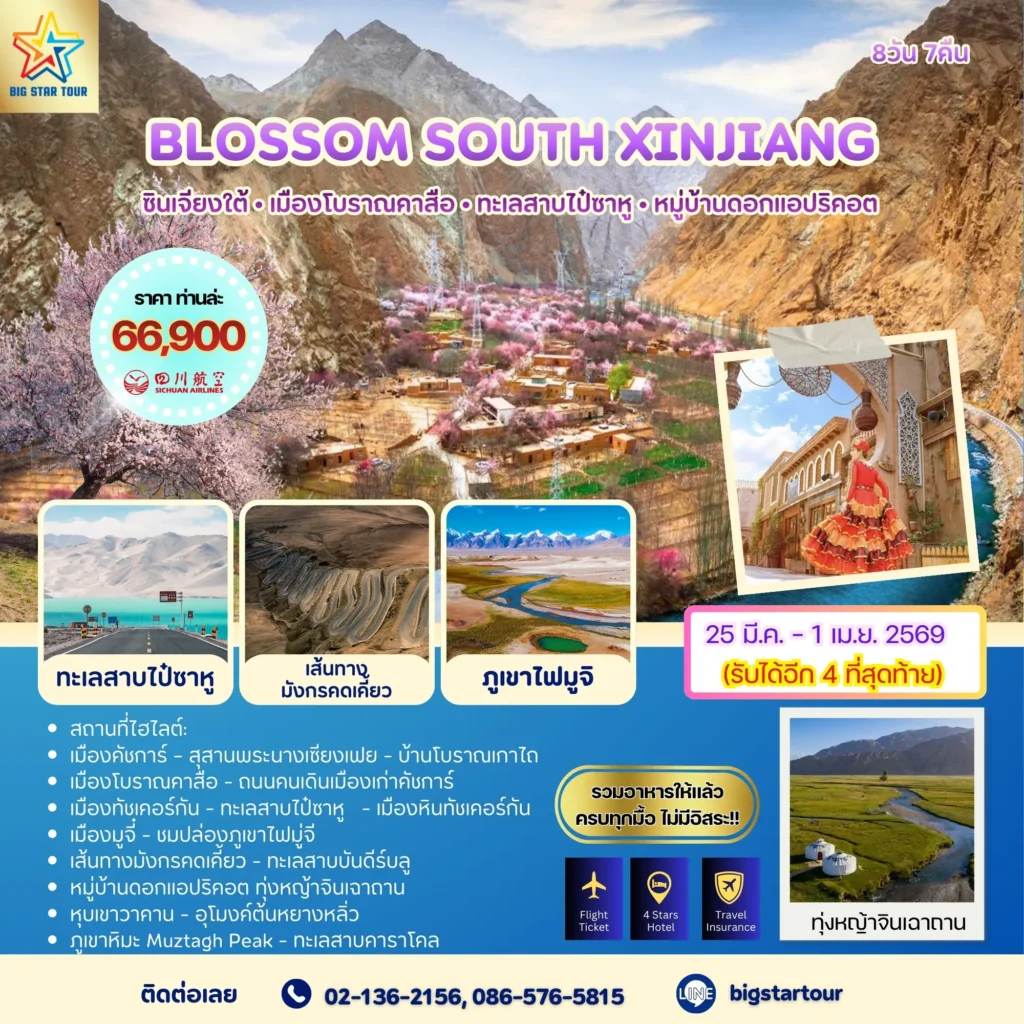 ทัวร์จีน[XINMARAPR] มหัศจรรย์ ซินเจียงใต้-แอปปริคอทบาน- คัชการ์ | 8 วัน 7 คืน admin February 24, 2026March 19, 2026 25 มีนาคม – 1 เมษายน 25698 วัน | 7 คืน ราคาโปรแกรมทัวร์8 วัน 7 คืนราคาเริ่มต้น / ท่าน66,900฿ รายละเอียดการเดินทางวันเดินทาง25 มีนาคม – 1 เมษายน 2569สายการบินไปกลับ Sichuan Airlines 3U / สนามบินนานาชาติสุวรรณภูมิสนามบิน ขาไป: 3U3936 BKK-TFU 18.00 – 22.00 / 3U8537 TFU-KHG 09.00 – 13.55ขากลับ: 3U8538 KHG-TFU 15.00 – 19.30 / 3U3935 TFU-BKK 14.55 – 17.00 Koh Chang Paradise Hill & Paradise Water Park พิกัดประทับใจ... ที่มอบความสุขตลอดการเดินทาง TRAVEL PLAN แผนการเดินทาง Map ติดต่อสอบถามการเดินทาง พร้อมดูแลและให้คำปรึกษาการเดินทาง ที่ตอบโจทย์ทุกความต้องการ 26/68 หมู่บ้านเอกกวินทาวน์โฮม ถนนเลียบคลองสอง แขวงบางชัน เขตคลองสามวา กรุงเทพมหานคร 10510 Hotline: 086-576-5815 Tel: 02-136-2156 , bigstartravelgroup bigstartour ทักแชท จองเลย!